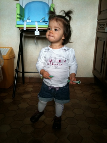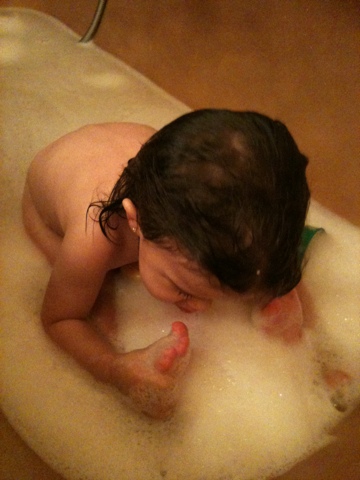 Manon vérifie que ses pieds ne puent pas dans le bain: