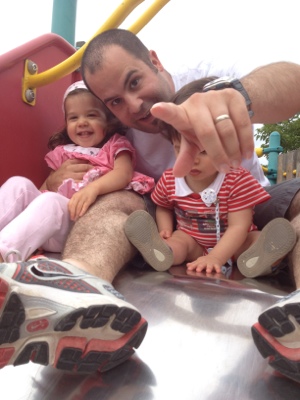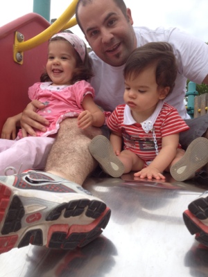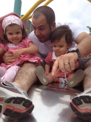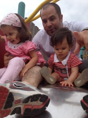 Manon avec son papa et son frère Quentin au toboggan